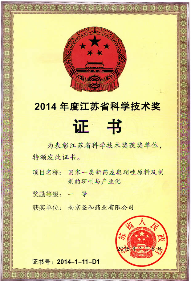 2014年度江蘇省科學(xué)技術(shù)一等獎(jiǎng)
