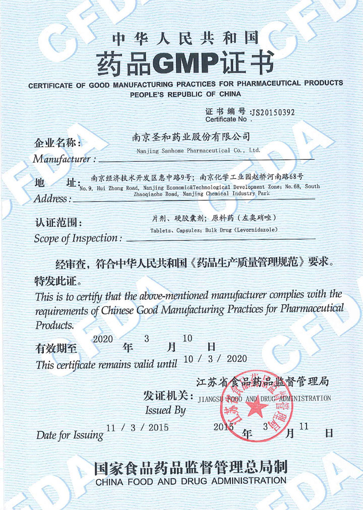 In March 2015, tablet, capsule, API (levornidazole) GMP certification, certificate number: JS20150392